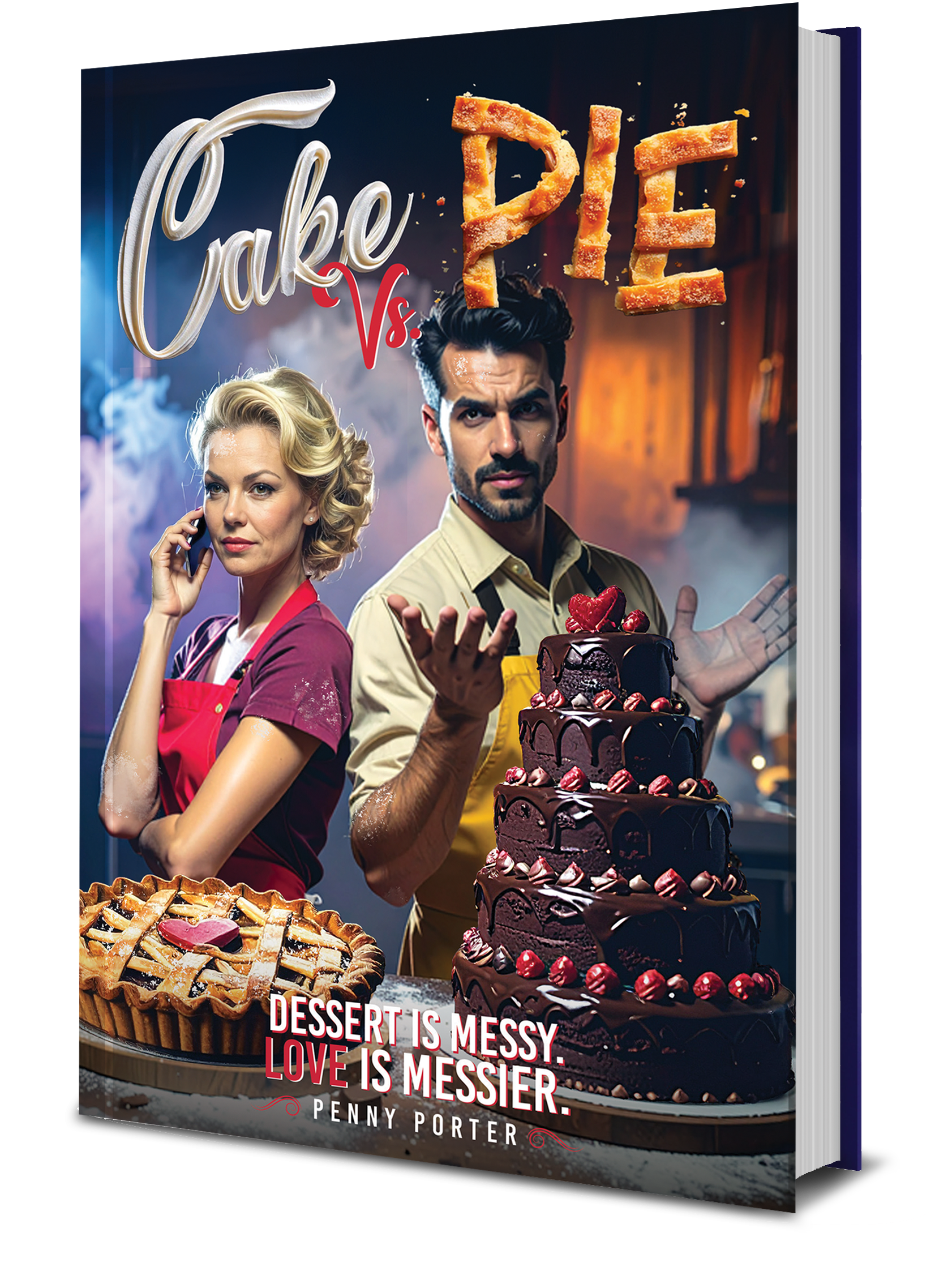 This book cover for Cake vs Pie was designed to visually capture the story’s playful rivalry and romantic tension through a bold, character-driven concept. As a creative studio, we developed a cinematic composition that places both protagonists front and center, each aligned with their signature dessert to instantly communicate conflict and chemistry. We combined styled food photography, expressive character direction, and a warm, dramatic lighting scheme to create depth, energy, and a sense of narrative in a single frame.