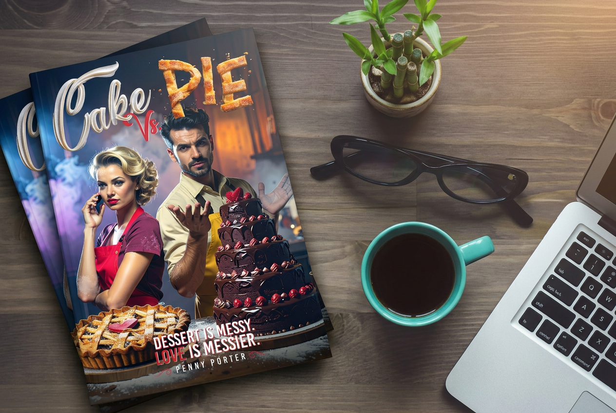 This book cover for Cake vs Pie uses bold, story-driven visuals to instantly communicate genre and tone. The opposing characters and desserts create a clear sense of playful rivalry and romantic tension, while distinct typography and warm, rich colors reinforce its contemporary romance appeal.